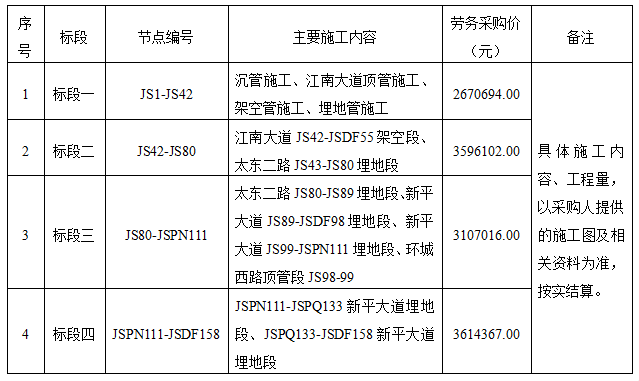 注:①項目實施過程中,出現(xiàn)工程量清單增減項的情況,若工程量清單增項,由已中選的各勞務(wù)供應(yīng)商實施,如增項清單在其他標段有相同清單,則其最終單價等于其他標段勞務(wù)采購工程量清單的單價乘以【1-下浮率(報價)(本標段)】,雙方簽訂補充協(xié)議;若工程量清單減項,勞務(wù)采購中選供應(yīng)商不得以此為由向采購人索賠。